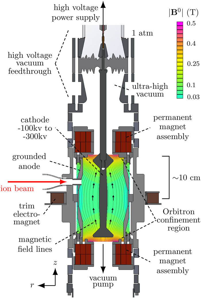 To explore the confinement of high-energy ions above the space charge limit, we have developed a hybrid magnetic and electrostatic confinement device called an Orbitron. The Orbitron is a crossed-field device combining aspects of magnetic mirrors, magnetrons, and orbital ion traps. Ions are confined in orbits around a high-voltage cathode with co-rotating electrons confined by a relatively weak magnetic field. Experimental and computational investigations focus on reaching ion densities above the space charge limit through the co-confinement of electrons. The experimental apparatus and suite of diagnostics are being developed to measure the critical parameters, such as plasma density, particle energy, and fusion rate for high-energy, non-thermal plasma conditions in the Orbitron. Initial results from experimental and computational efforts have revealed the need for cathode voltages on the order of 100–300 kV, leading to the development of a custom high voltage, ultra-high vacuum bushing rated for 300 kV.
