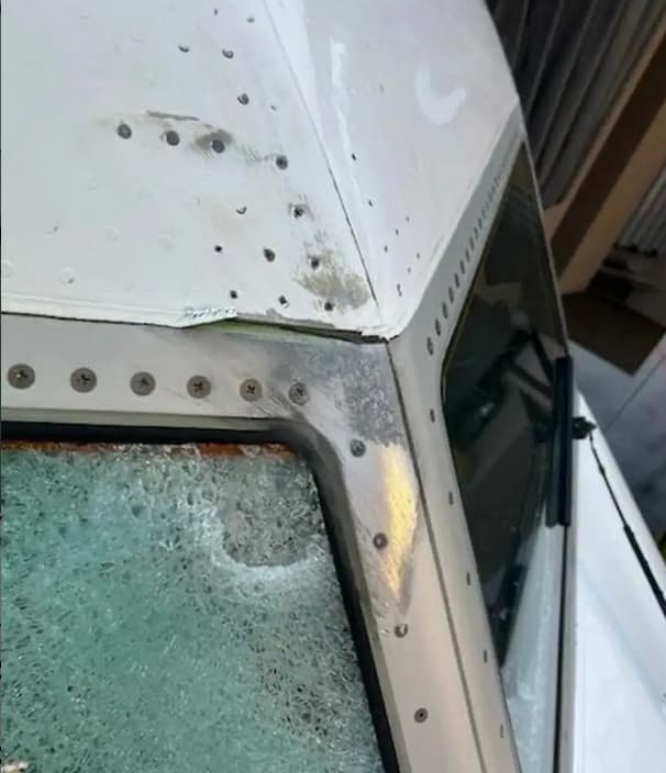From the image in the article it appears that the impact was received by the center post, not the windshield directly. It seems that the deformation of the windshield frame is what caused the glass damage. How lucky: