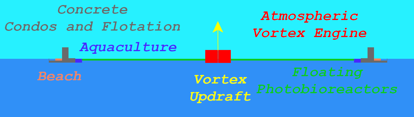As has been previously discussed, the next green revolution will provide at least a factor of 10 lower area requirement for agriculture, based on floating photobioreactors. These photobioreactors require wave-break shelter from even moderate sea states – shelter naturally provided in the lagoon of an artificial atoll. In the tropical doldrums the primary production of agricultural feedstocks would be far higher than the annualized 35g/m^2/day measured for more northerly (Mediterranean) climates, but let’s stick with 35g/m^2/day to be conservative.