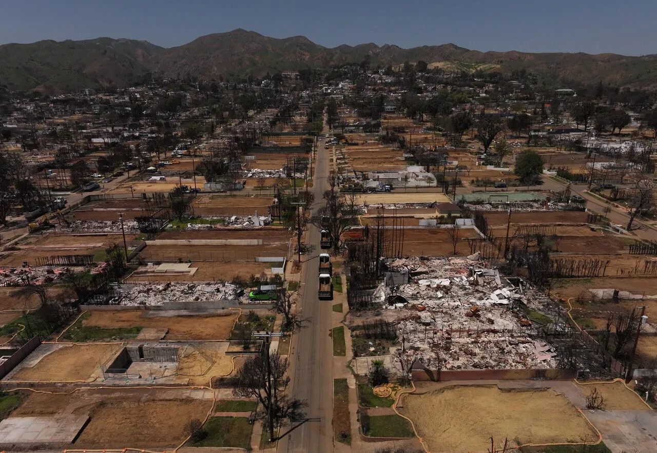 An aerial view of a neighborhood destroyed by the Palisades Fire on May 07, 2025 in Pacific Palisades, California. (Photo by Justin Sullivan/Getty Images)