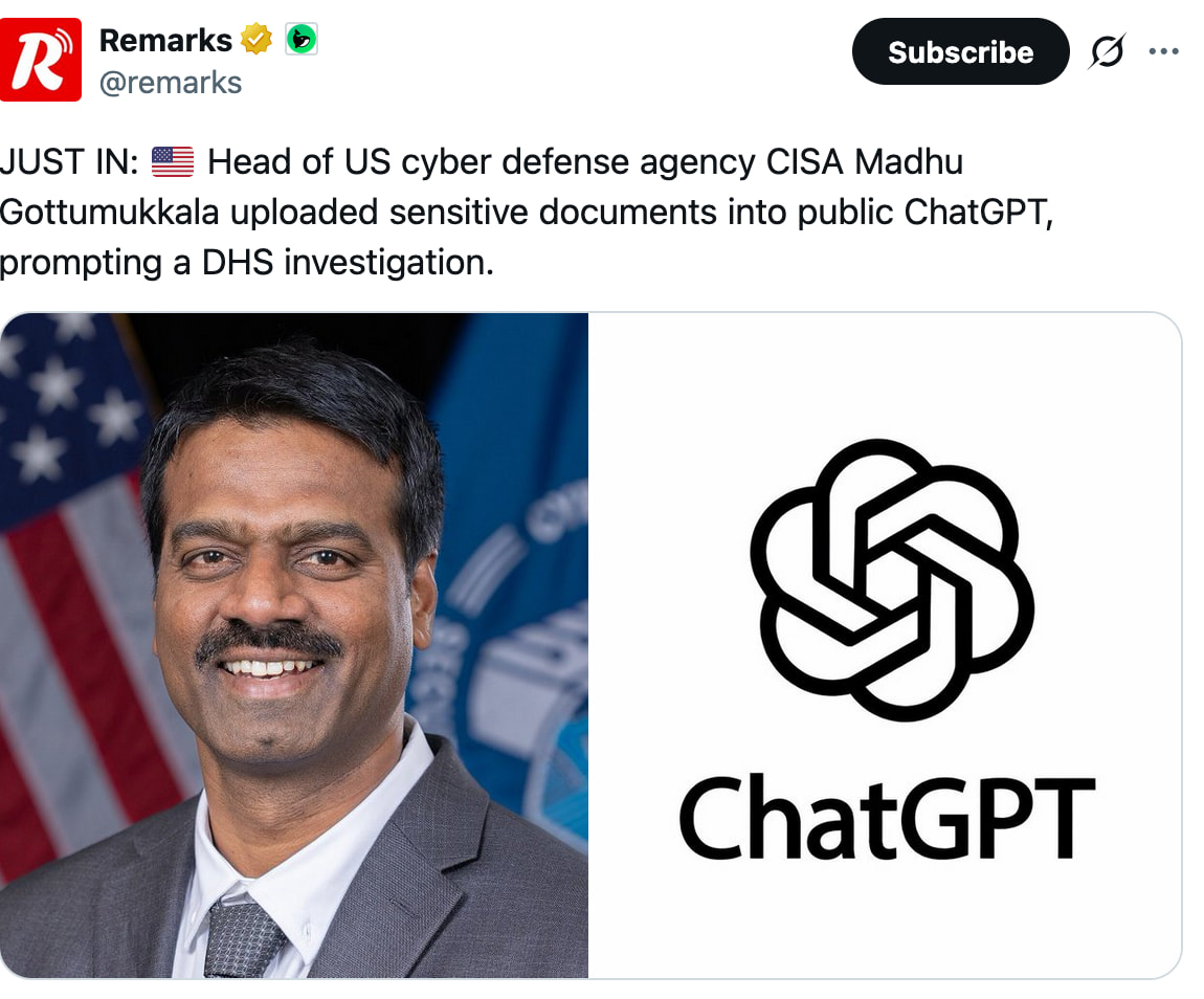 The head of US cybersecurity just demonstrated exactly why every company blocks ChatGPT by default.