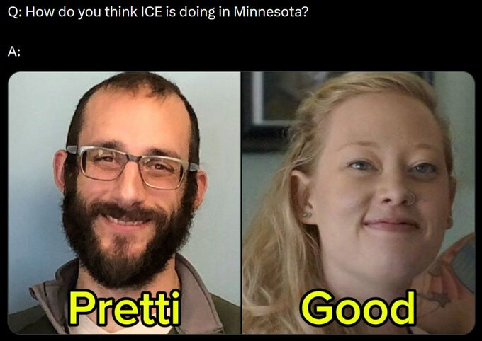 There is a dark cold maelstrom of violence underlying our society —underlying ANY ordered society, I’m not singling the US out. It’s gotta be there if we wanna live like we do. We have for the most part successfully displaced it to pockets of urban poverty and to our huge prison population. But the mechanism to suppress murderous anarchy is there, it HAS to be. The people in the,ah, upper crust usually have no experience of it, they sit unmolested and opine in favor of more draconian laws, about the regrettable necessity for the death penalty. But at a time like this cracks appear, and some of those people dip a toe in, and get sucked under. They don’t actually believe THEIR bodies can be broken, they’ve never imagined being shot! SHOT! What?!?! no, no, no! We just wanted to be seen nearby, we just wanted to make our opinion clear! And for that we end up bloodied or DEAD?? That is an outrage, we are GOOD! (in fact “I am Good!” or “I feel Pretti!” could be the current “je suis Charlie!”)