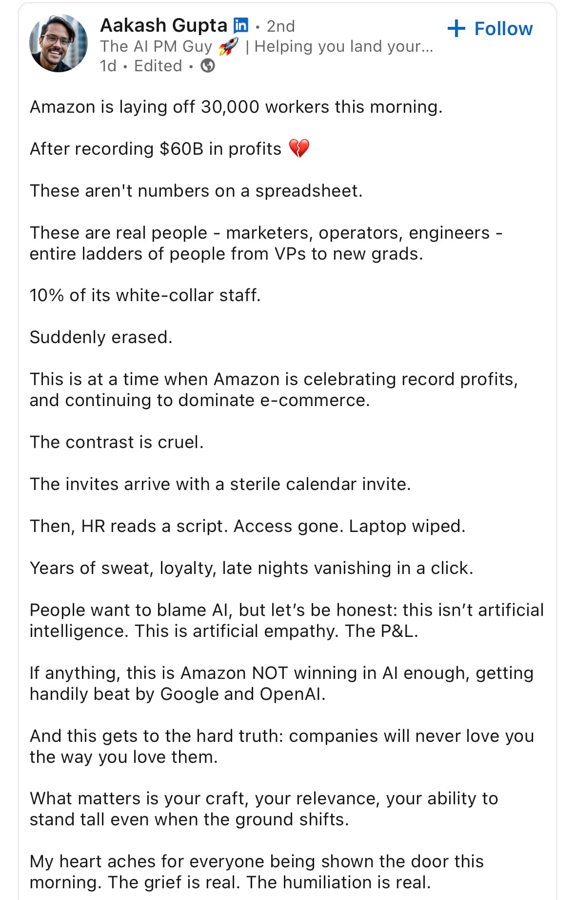If Amazon didn’t exist, every single person employed at Amazon (not just the 30k workers laid off) would not be working there. Amazon employes about 1.56M worldwide. Another way to look at this is that more than 1.5M are employed by Amazon.