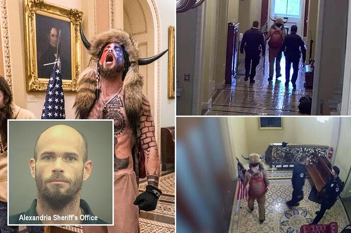 Newly released surveillance footage aired on Tucker Carlson Tonight shows Jake Angeli (also known as the QAnon Shaman) being escorted to the Senate floor during the January 6th “insurrection”.