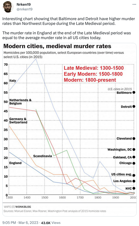 One has to wonder about where the data on “murders” in Medieval Europe came from? And what is the +/- uncertainty band around those numbers. To say nothing about how the authors of the data adjusted for things like Europe’s bloody 30 Years War and Hundred Years War? There must have been lots of murders that were mixed in with combat deaths . Presumably, there were also lots of deaths from “accidents” in farms, forests, and boats that would have been deemed “suspicious” if there had ever been an investigation.