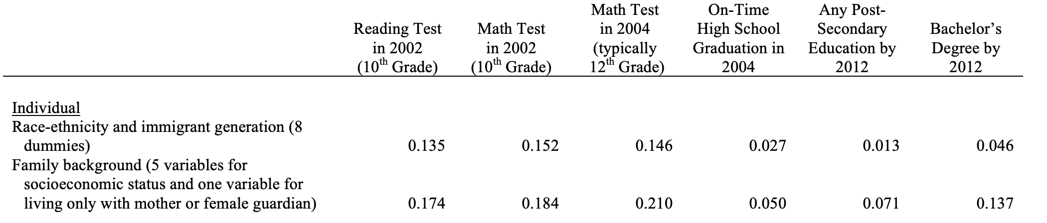 The authors of the paper found, unsurprisingly, that race/ethnicity and family background were the most important factors in outcomes, at least in the short term. Other work has shown that the most important aspect of family background is genetic, so these two are arguably correlated. The correlations fall in later life but these two are still at the top.