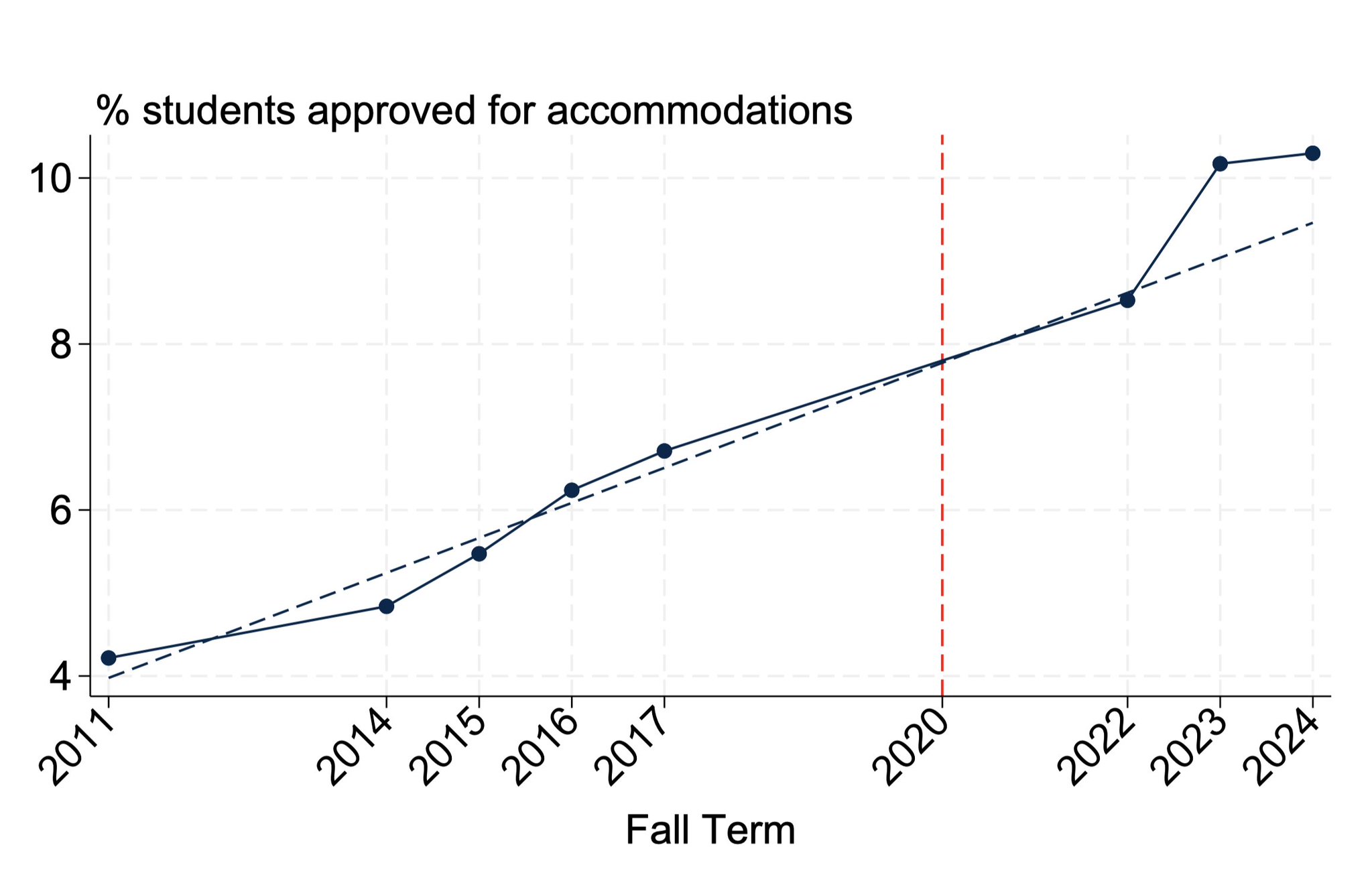 FWIW, my experience conforms with the latter (the number of requested accommodations are rising quickly) but not the former. Smallish sample size but my sense has been students who are struggling for reasons owing to behavior or ability have been leaning on these accommodations but they are not helping much.