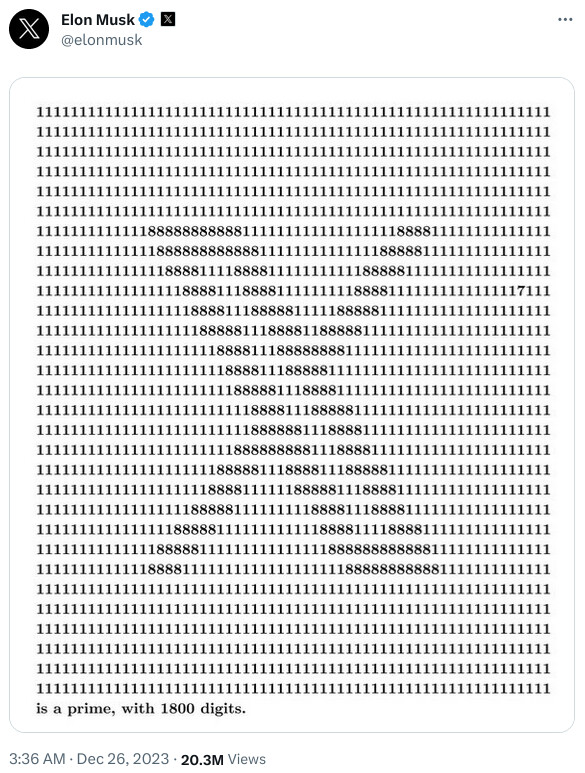Elon posted this as a screen shot, so Iâm not going to type in the whole thing in order to run a MillerâRabin primality test to see if itâs true. My guess is that itâs really prime, and the little â7â lurking in there: